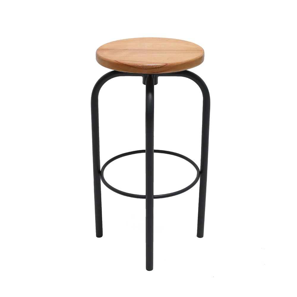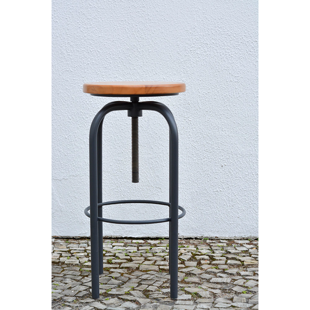 Banco giratório com estrutura tubular e assento em madeira. Altura regulável. Perfeito para dar um toque industrial ao seu ambiente.